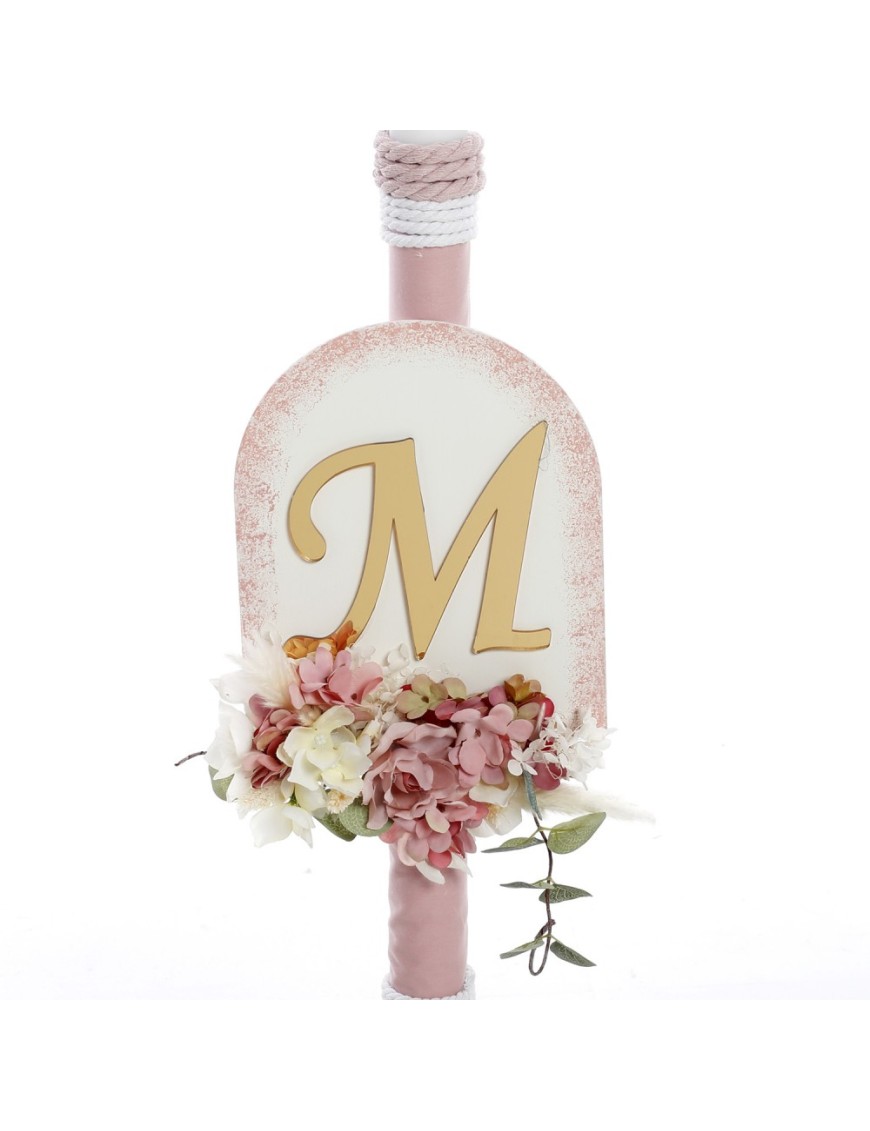 Λαμπάδα: Εντυπωσιακός στολισμός με πλούσιες στρώσεις από ροζ και λευκό τούλι, συνθέσεις λουλουδιών και ξύλινο στρογγυλό κάδρο που απεικονίζει το floral θέμα και το αντίστοιχο μονόγραμμα.