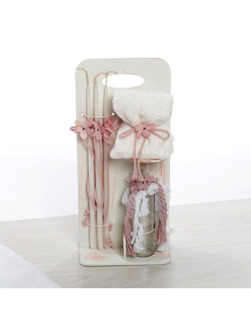 Σετ Λαδιού: Λευκό ξύλινο stand που περιλαμβάνει μπουκάλι λαδιού, σαπούνι και 3 κεράκια, όλα ασορτί διακοσμημένα με ροζ τούλι και floral λεπτομέρειες.